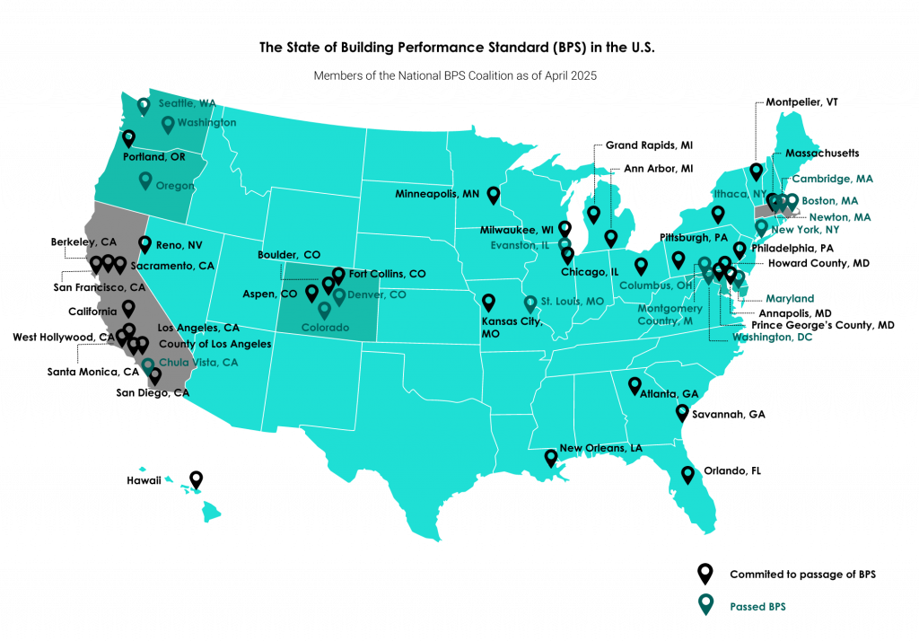 The National BPS Coalition, launched in 2022, supports cities moving from prescriptive codes to performance-based standards, letting owners choose how to meet targets. About 15 cities already have BPS in place, with 30+ committing by next year.