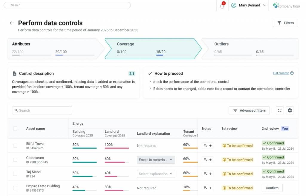 Built-in verification checks automatically flag anomalies, coverage gaps, outliers, and year-on-year variations. The four-eyes principle ensures that each validation is reviewed collaboratively, with comments, explanations, and evidence captured. All logs are time-stamped and consolidated within a downloadable audit pack, giving auditors full transparency and significantly reducing review time.